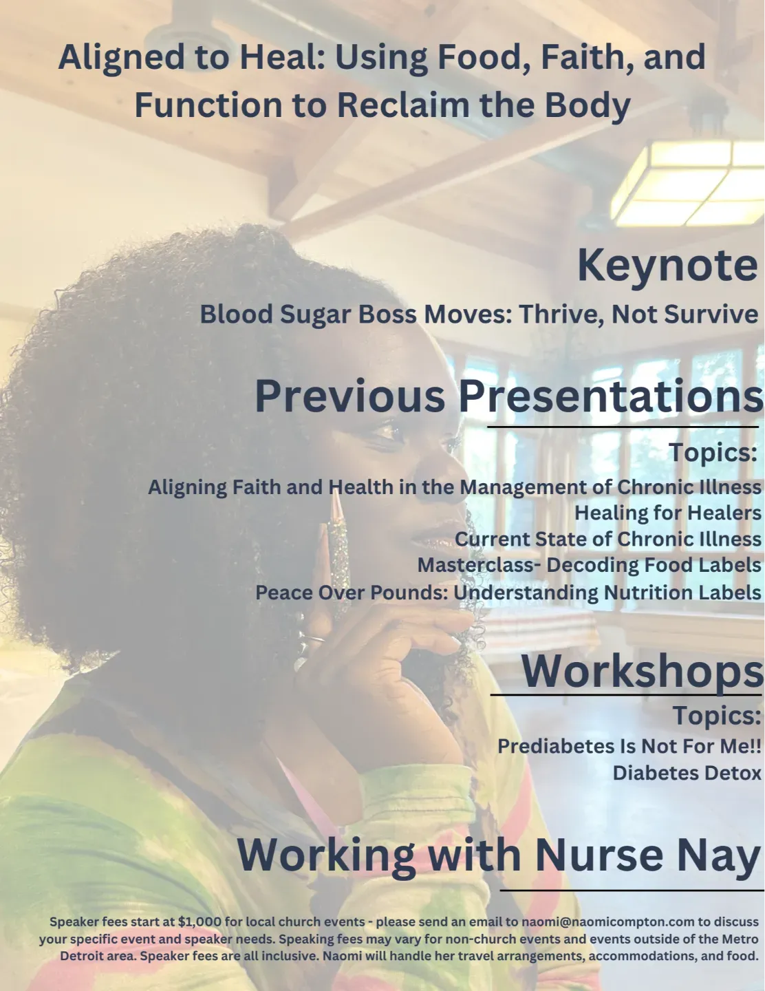 Her lifelong passion is to empower wellness and health in her community and beyond through the simplicity of nature's resources and health education. As an RN of 23+ years, Naomi has always advocated for the health and well-being of the people in her care. For Naomi, the most valuable aspect of being a health advocate is empowering her clients to take control of their health. In addition to being an RN, Naomi is a speaker, contributing author of the book, “The Breakthrough Method: A Journey to Health, Healing and Wholeness”, a certified Christian Health Coach, CEO of Nurse Nay Health Coaching and Herbal Fusion LLC, and more. Naomi empowers others to draw inspiration that connects health with faith.